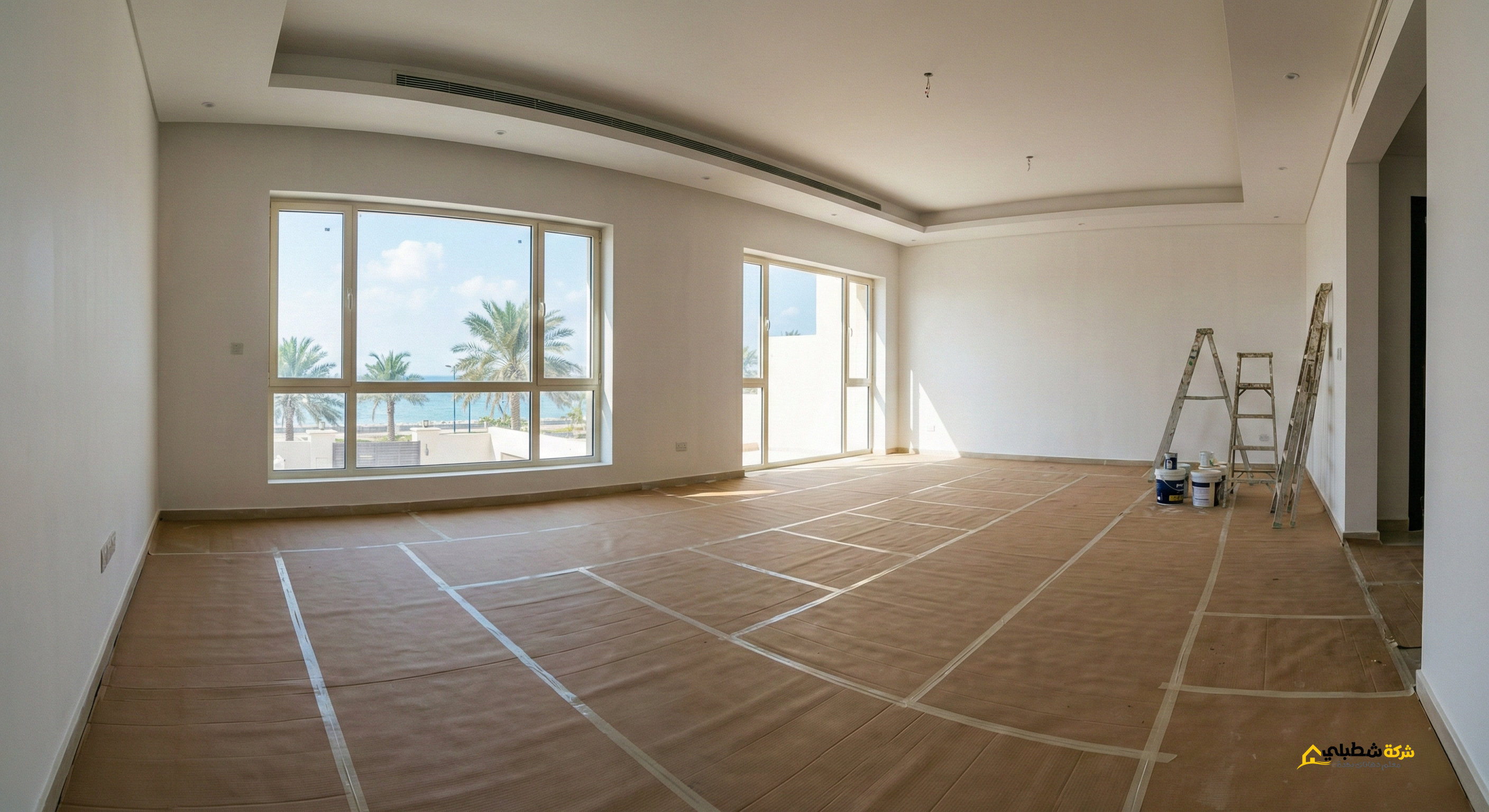 أما الأرضيات، فمن الضروري تغطيتها بـ “الكريب المحمي” أو الكرتون المقوى وليس النايلون فقط، لأن النايلون ينزلق وقد يسبب إصابات للعمال أو يسمح بمرور بقع الدهان إذا تمزق.